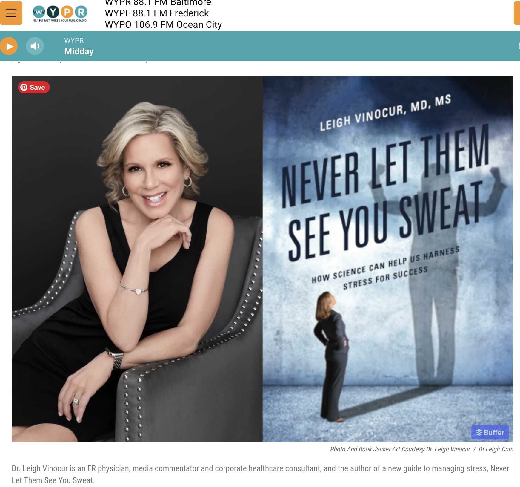 October 21, 2025 -- Host Tom Hall from WYPR devoted his radio/podcast episode to interviewing Dr. Leigh to learn about stress, how to manage it, and actually benefit from it. Her new book, Never Let Them See you Sweat, published by Bloomsbury, is available now. Listen to the interview by clicking Tune In below.